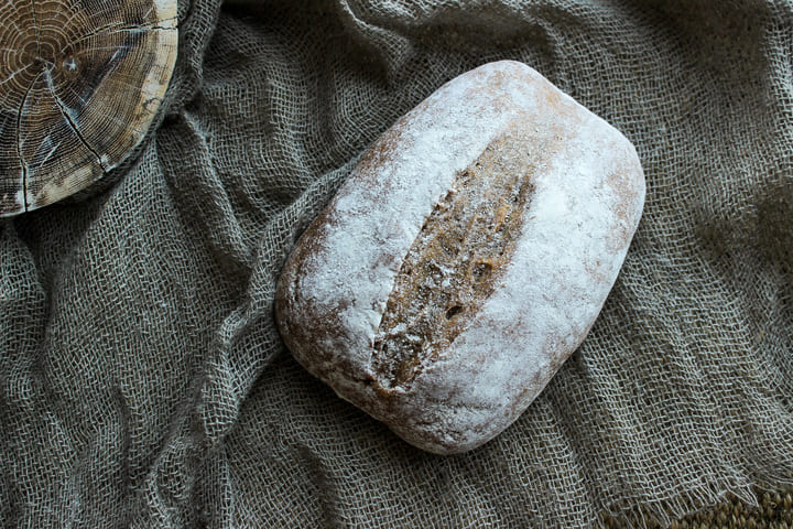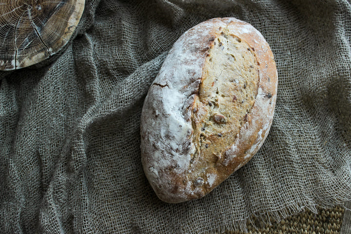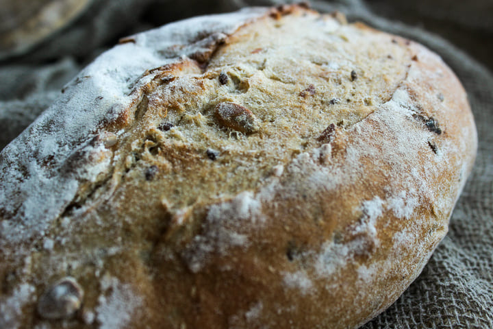 Пшеничный хлеб с оливками и сыром «Пармезан» длительного брожения со свежесмолотой цельнозерновой мукой на натуральной пшеничной закваске без добавления промышленных дрожжей. Идеален для раннего ужина как отдельное блюдо, так и в сочетании с сыром, авокадо, домашним паштетом или вяленой прошутто, а так же получаются вкуснейшие слегка обжаренные гренки.