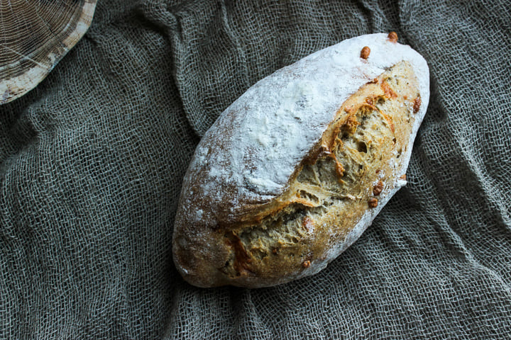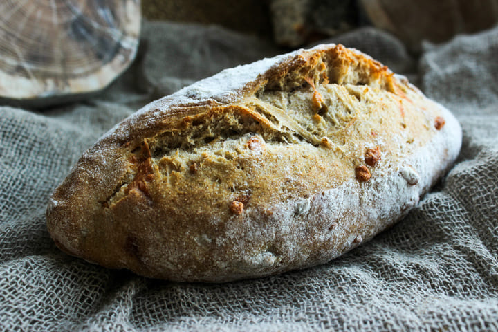 Пшеничный хлеб с оливками и сыром «Пармезан» длительного брожения со свежесмолотой цельнозерновой мукой на натуральной пшеничной закваске без добавления промышленных дрожжей. Идеален для раннего ужина как отдельное блюдо, так и в сочетании с сыром, авокадо, домашним паштетом или вяленой прошутто, а так же получаются вкуснейшие слегка обжаренные гренки.